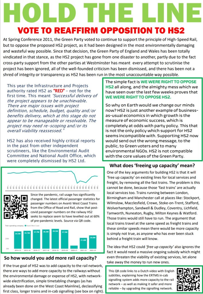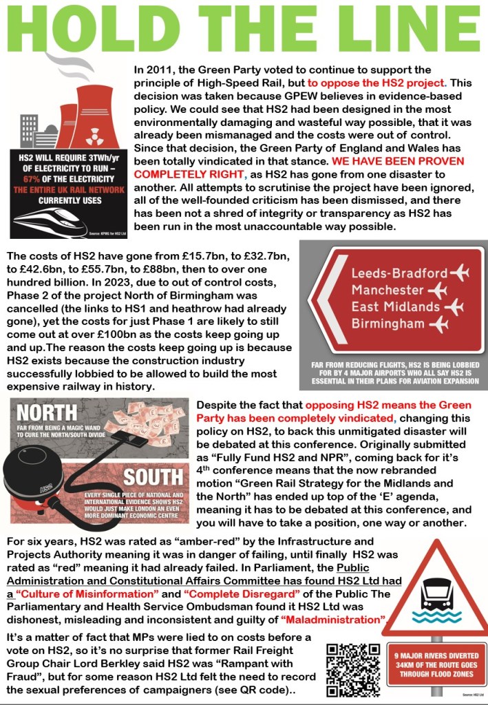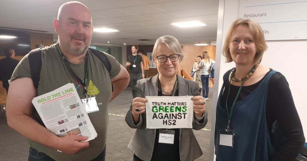 In spring 2023, a group of like-minded Green party activists came together to organise opposition to a motion submitted to the Green Party Conference entitled “Fully fund HS2 and Northern Powerhouse Rail”. After a lightning-quick mobilisation, that motion ended up running out of time -twice – for a full report click here.