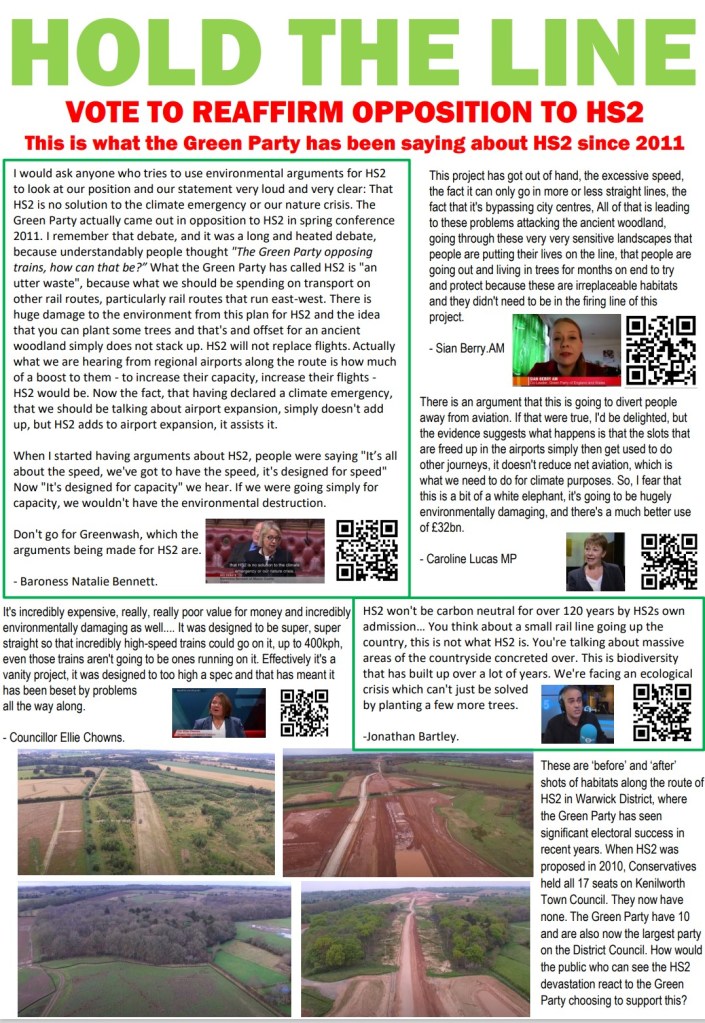 Following Green party Conference 2024 in Manchester [YOUR LOCAL] Green Party wishes to reaffirm opposition to the construction of HS2.