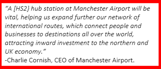 As has been said on numerous occasions, HS2 does not go to airports to discourage people from going to airports! We simply cannot understand how supporters of HS2 ignore the fact that bosses at both Birmingham and Manchester Airports have gone on public record saying they see HS2 as essential to expanding their international routes. And if HS2 was really intended to take flights out of the air, it would connect with HS1 and the Channel Tunnel, instead of stopping half a mile short at the wrong London station. Well, if it even gets that far……